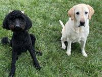 Stella, a black golden doodle, wasn’t thrilled when Harlee, a yellow Lab, joined the family, but they have since grown close, said owner Megan…