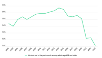 Currently, 51.1% of adults drink alcohol, down from a peak of 56.7% in 2014