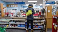 Woman in a winter coat purchasing medication at a CVS pharmacy counter.