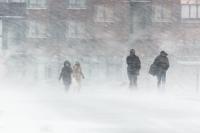 The blizzard, strong wind, sleet, against the background of houses blurred silhouettes of people, they try to hide from bad weather, overcome …