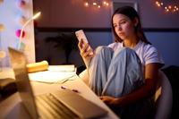 Worried Teenage Girl Sitting At Desk In Bedroom At Home Looking At Mobile Phone At Night