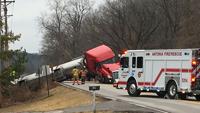 A tractor-trailer hauling a large amount of oil-based paint overturned and fell down an embankment on Old Lemay Ferry Road north of Frisco Hil…