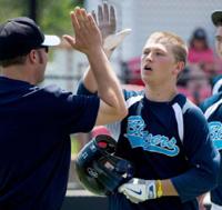 Shane Pollard gets a high-five from assistant coach Matt Holborow after hitting a walk-off two-run homer to defeat the visiting STL Tigers.