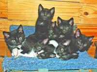 I took this photo of a passel of kittens at my home in June 2013. The month-old-kitties are Bandit, Elsie, Little Bit, Butternubs, Dora, Skitt…