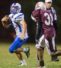 Jefferson's Andrew Graves heads outside for yardage under the pursuit of Cardinal Ritter's Jeff Hayes in Ritter's 52-30 victory over the Blue Jays in the Class 2 District 2 championship game on Nov. 6. Graves ran for 128 yards and one touchdown on 22 carries in the game.