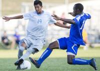 Doroteo Luviano of Jefferson College, left, tries to make a cut around an STLCC defender in the Vikings' 4-0 victory at Hillsboro.