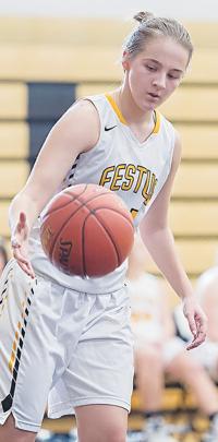 After sinking a 3-point basket to start the last stanza, Oetting outhustled everyone the length of the floor and was sent flying on her stomach under the Herky goal after scoring and getting fouled. She made the free throw and pushed the Festus lead to 49-36 with 7:30 in the game.